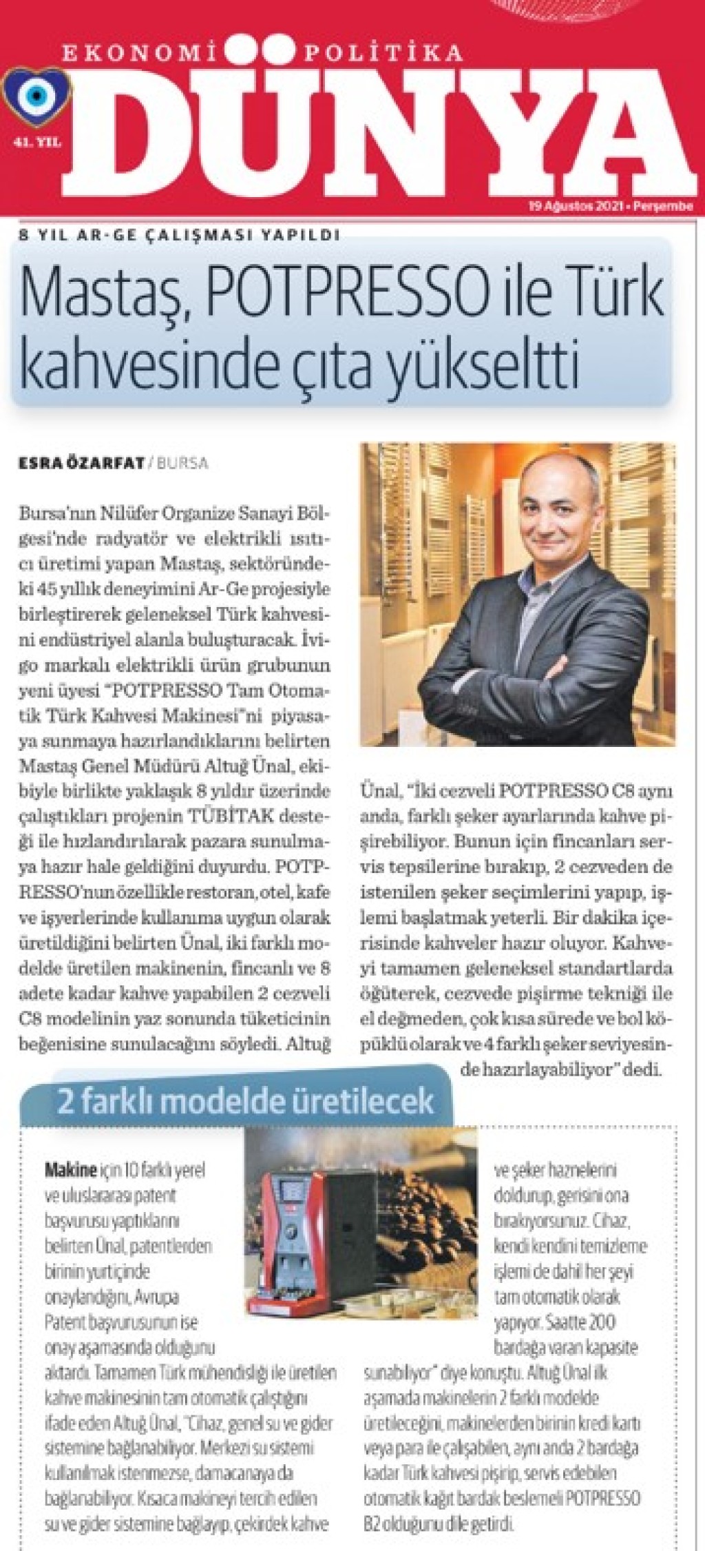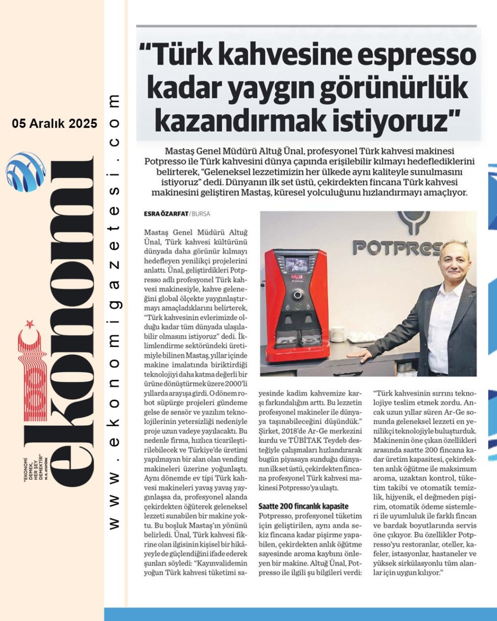 Mastaş Genel Müdürü Altuğ Ünal, profesyonel Türk kahvesi makinesi Potpresso ile Türk kahvesini dünya çapında erişilebilir kılmayı hedeflediklerini belirtti.